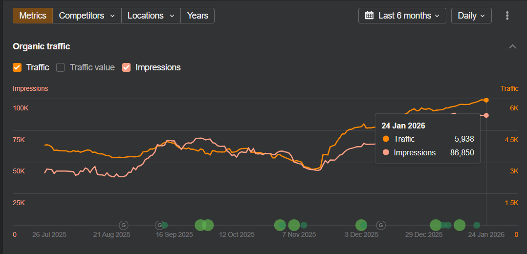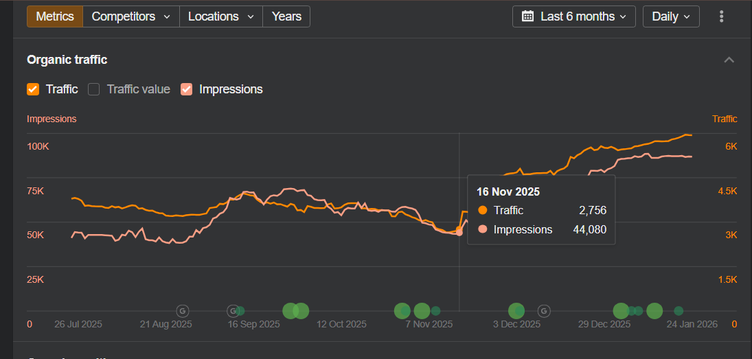 Achieved 115% traffic growth and +42,770 impressions (+97%) in ~70 days through restructuring, topical blogging, and entity-based SEO.